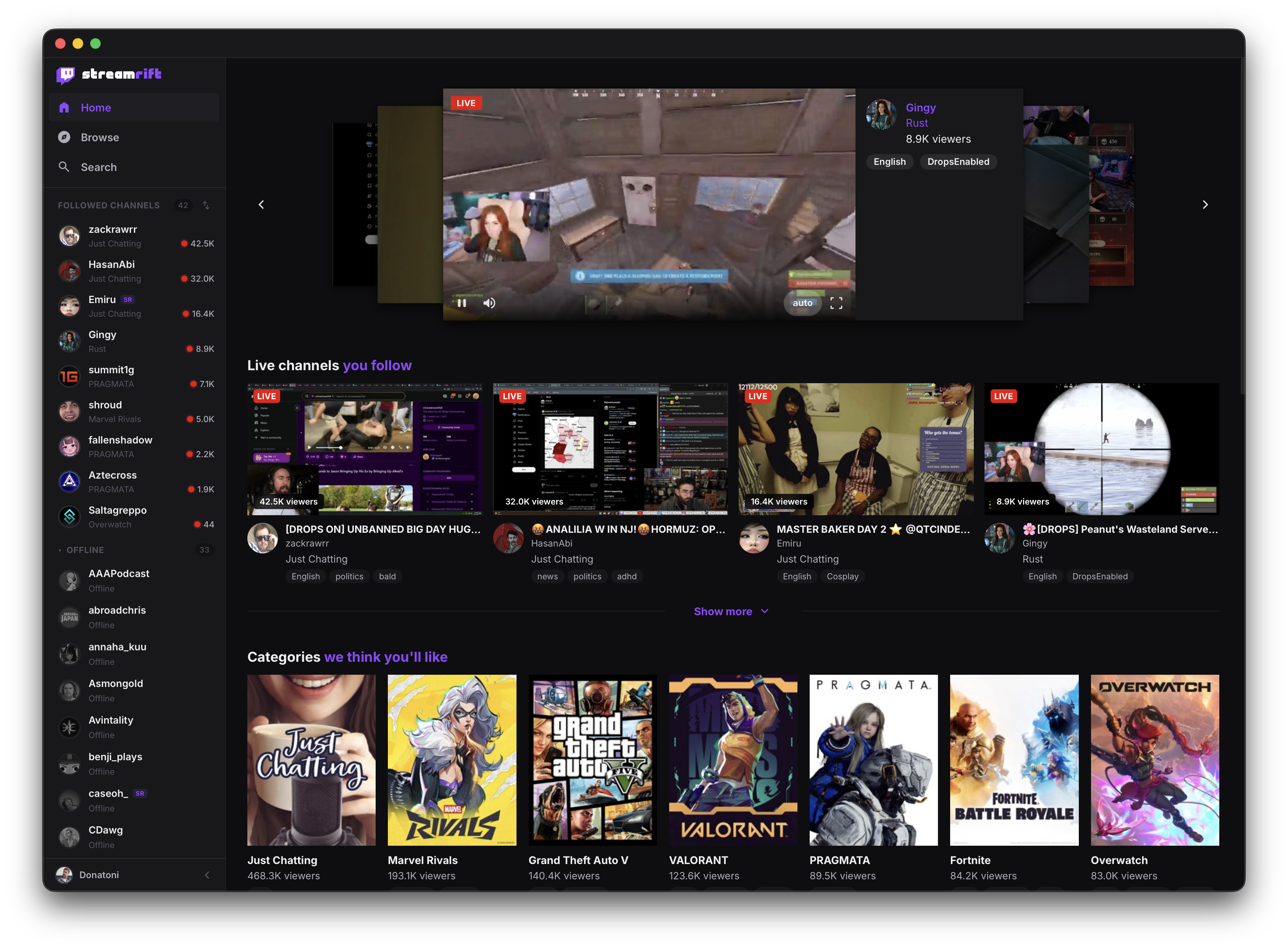 Split your window 1+2 for a co-stream with commentary, or 2×2 for a Rocket League tournament. Every divider is draggable — snap layouts are just starting points.